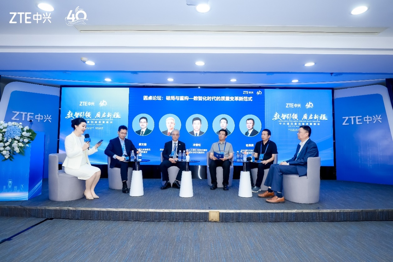 在圆桌论坛环节,中兴通讯首席质量官晏文德,深圳市质量强市促进会执行会长刘万涛,哈尔滨工业大学(深圳)研究员、博士生导师、特殊环境物质科学研究院院长冷雪松,中国质量认证中心深圳分中心主任黄新宇,中兴通讯无线及算力产品经营部副总经理柏燕民以《破局与重构—数智化时代的质量变革新范式》为主题,就数智化浪潮下的质量边界重塑、质量协同互信产业链共建、质量人才培育等热点话题展开讨论。