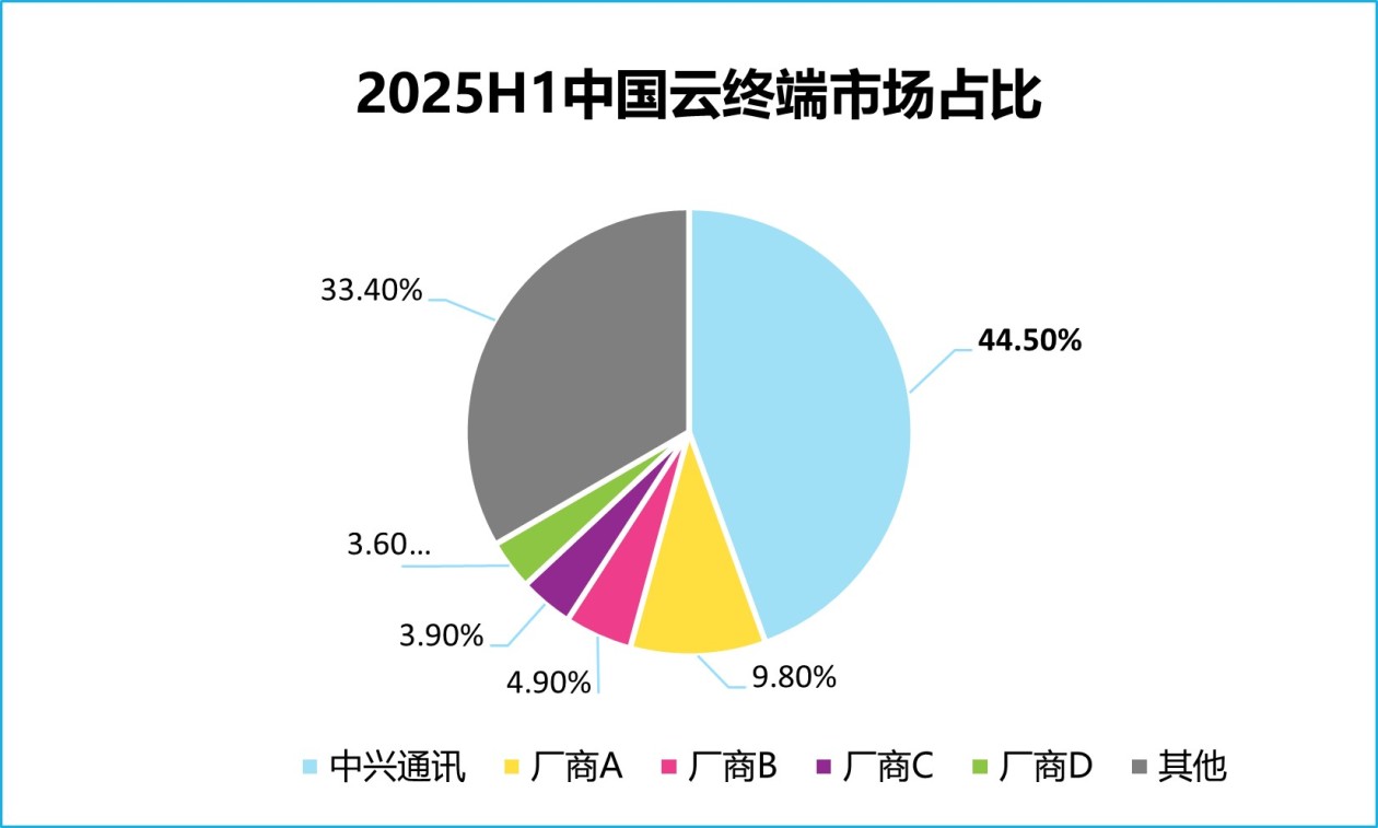 近日,国际数据公司IDC发布了《2025H1中国云终端市场跟踪报告》,中兴通讯以44.5%的市场占有率,蝉联中国云终端市场冠军,连续两年稳居榜首,在云终端总体市场出货量、VDI解决方案云终端、商用云终端市场出货量均位列第一,并在消费类云终端市场持续大幅领先。