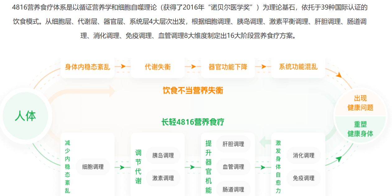 长轻“4816营养食疗体系”以循证营养学与细胞自噬理论为基础,融合39种以上国际认证饮食模式,从细胞、代谢、器官、系统四大层面入手,围绕八大修复维度,通过16大阶段(已迭代至30余阶段)提供量化干预。该体系已衍生60余条支线,可覆盖更广泛健康场景与差异化需求。