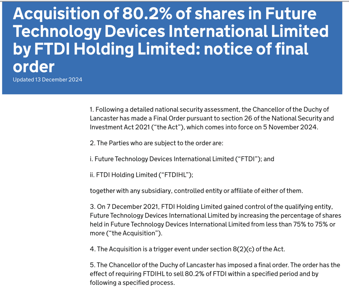 【环球网科技报道 记者 张阳】2021年12月,中国半导体投资机构建广资产以4.14亿美元完成对英国芯片设计企业FTDI(Future Technology Devices International)80.2%股权的收购,被视为中资在高端模拟芯片领域一次战略性布局。然而不到三年,这一交易却遭遇逆转。2024年11月5日,英国政府以“国家安全”理由,强制要求建广资产出售所持全部FTDI股权,并设定2025年12月底为最终期限。这是继荷兰安世半导体事件后,中资半导体海外并购再次遭遇强制干预的典型案例,折射出全球半导体产业链日益割裂的现实困境。